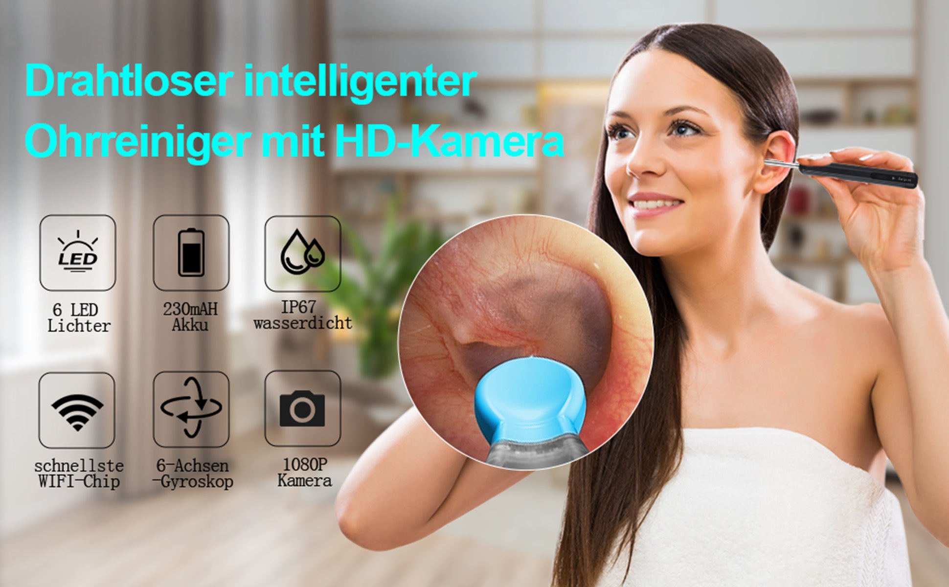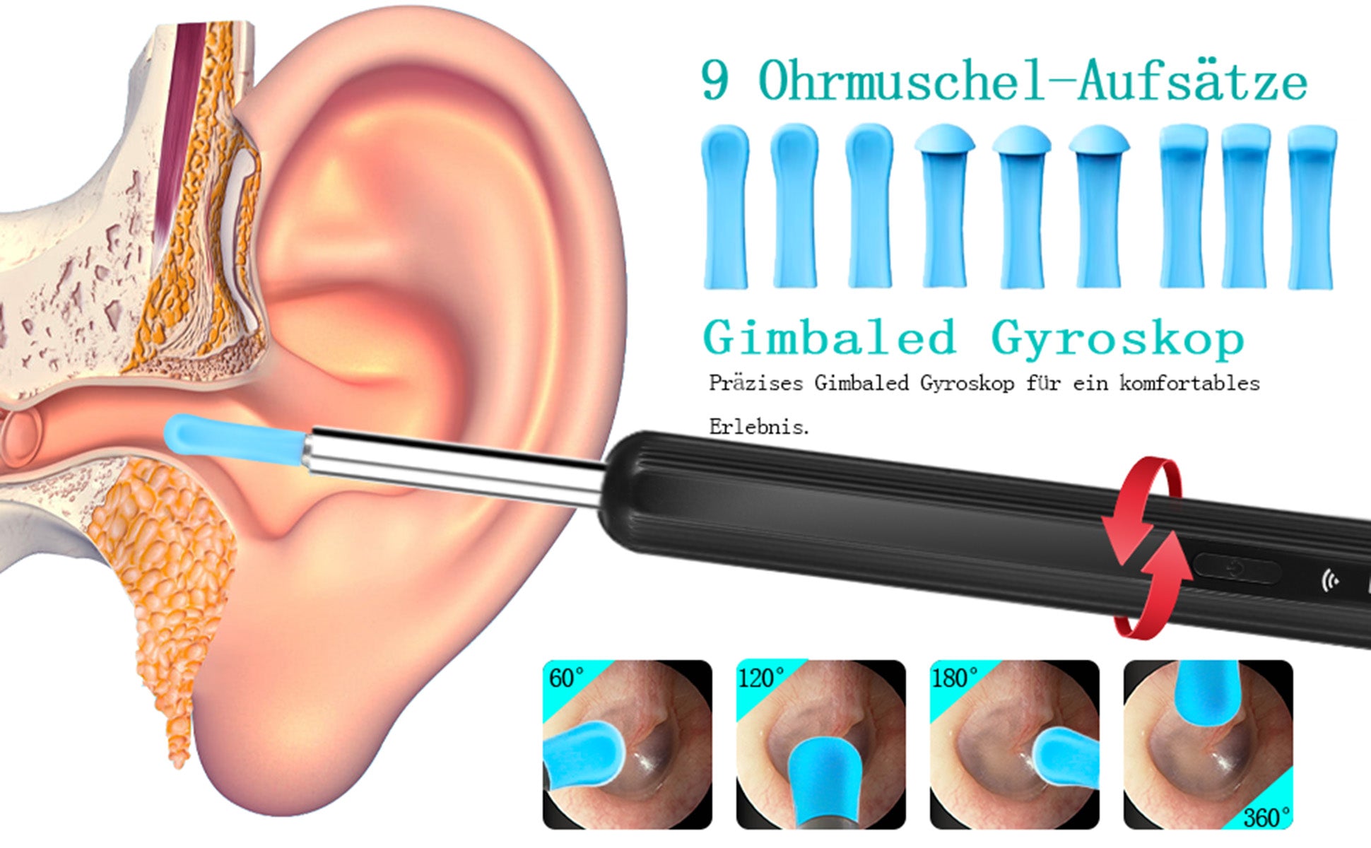 Austauschbare Silikon Abdeckung- Die austauschbaren Silikon-Ohrstöpsel sind weich, flexibel und haben den richtigen Neigungswinkel für eine sichere und bequeme Ohrenreinigung, ohne den Gehörgang zu verletzen. Bitte stellen Sie vor der Verwendung sicher, dass die Silikon-Ohrstöpsel fest sitzen